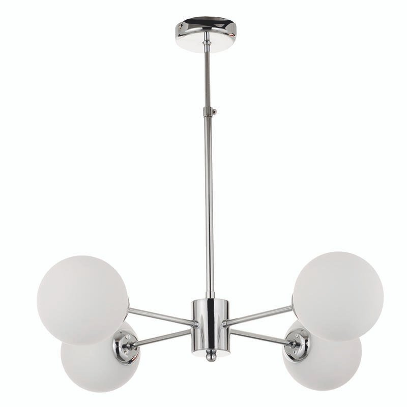 Πρόκειται για ένα χρώμιο μεταλλικό φωτιστικό με λευκή οπαλίνα στο τελείωμα και τέσσερις λαμπτήρες. Η μίνιμαλ σχεδίασή του το τοποθετεί ιδανικά σε οποιονδήποτε μοντέρνο εσωτερικό χώρο. Η ανάρτησή του είναι μεταλλική και ρυθμιζόμενη ώστε να προσαρμοστεί ιδανικά στον χώρο τοποθέτησής του.