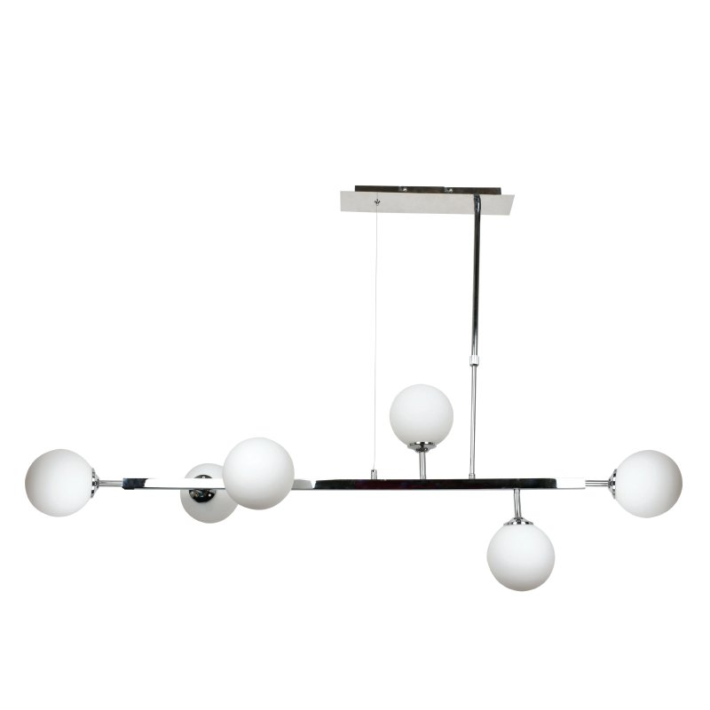 Πρόκειται για ένα χρώμιο μεταλλικό κρεμαστό φωτιστικό με λευκή οπαλίνα και έξι λαμπτήρες. Τοποθετείται ιδανικά πάνω από τετράγωνα και ορθογώνια τραπέζια, ώστε να επιτευχθεί ομοιομορφία. Η ανάρτησή του δίνει τη δυνατότητα να προσαρμοστεί στον μοντέρνο χώρο τοποθέτησή του.