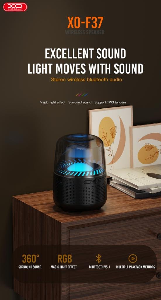 Το XO bluetooth ηχείο F37 είναι συμπαγές και επιπλέον εξοπλισμένο με φώτα RGB LED και έχει επίσης πολλές υποδοχές για να συνδέσετε την αγαπημένη σας μουσική. Η ενεργή διεπαφή Bluetooth σάς επιτρέπει να ακούτε μουσική που αποστέλλεται ασύρματα από μια συσκευή που υποστηρίζει τεχνολογία Bluetooth (π.χ. smartphone, tablet).